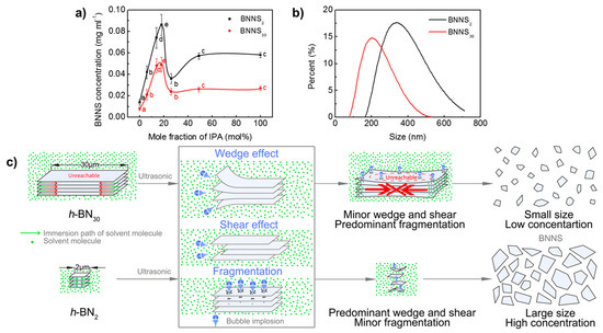 Based on the abovementioned results, the effect of raw h-BN size on exfoliation is proposed as shown in Figure 2c. During ultrasonic irradiation, “fragmentation”, “shear” and “wedge” effects are generated, due to the implosion of micrometre-sized bubbles [42,43]. For h-BN30 with large lateral size and high crystallinity, it is hard to achieve sufficient immersion and insertion of solvent molecules, leading to weak “wedge” and “shear” interactions. Therefore, the “fragmentation” effect is predominant and thus small nanosheet dispersion with low concentration are produced. For h-BN2 with small size, co-solvent molecules can relatively easily insert into the stacks and weaken the van der Waals interactions between layers [44]. In this case, “wedge” and “shear” effects are predominant, leading to large nanosheet dispersion with high concentration.