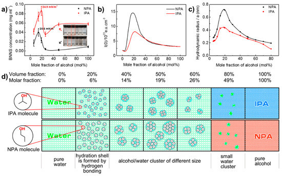 The resembles of Figure 4b,c and Figure 4a suggest that at least the size of alcohol/water cluster plays a critical role in BNNS exfoliation. As such, the formation and evolution process of water/1,2-propanol co-solvent clusters are proposed and illustrated in Figure 4d. When the NPA and IPA concentration in water increases to 6 mol%, a hydration shell is gradually formed around the alcohol molecules with the establishment of a hydrogen bond network under the envelope of water molecules [53,63]. Since the NPA chain is longer than the IPA molecule, the radius of the hydrated shell of NPA molecule is larger than that of IPA. With the increase of alcohol concentration, the hydration shell of NPA molecules is more likely to collide with each other, and agglomerate to form bigger co-solvent clusters. Thus, compared to the water/IPA system, a water/NPA solution presents much higher zero-angle X-ray diffraction intensity (Figure 4b), and the BNNS yield peak appears even earlier (Figure 4a). The size of both cluster peaks at 19 mol% alcohol, which is exactly the optimal composition to produce BNNSs for water/IPA. This seems reasonable as large-sized molecules are considered favourable for good BNNS dispersion [16,29]. However, the optimal co-solvent ratio for water/NPA is 14 mol% of NPA (Figure 4a), at which the cluster radius is smaller than its peak value. Combining the fact of larger-sized water/NPA cluster producing much less BNNSs, it is certified that only appropriate cluster size favours h-BN exfoliation and BNNS stabilization, giving an optimal BNNS concentration. When alcohol concentration continues to increase to about 50 mol%, it is difficult to form hydration shell with alcohol molecules due to too few water molecules, therefore only small water clusters form in the solution, and the exfoliation effect is close to that of pure solvent.