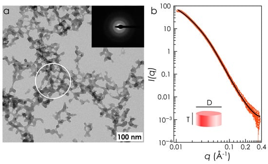 Small-Angle X-ray scattering (SAXS) measurements were performed on the in-house instrument at Aarhus University [], which uses a rotating Cu anode source. The beam is collimated and focused by side-by-side Montel multilayer mirrors and the scattered X-rays are collected by a Vantec 500 detector (Bruker AXS, Karlsruhe, Germany). The collimation system consists of two-pinholes, where the one close to the sample is a scatterless pinhole with edges of Ge crystal [,]. The sample powders were mounted by picking up a thin layer of each sample by matte acetate Scotch tape. The samples were then mounted in the beam in the integrated vacuum of the SAXS instrument and a piece of the same tape was measured and subtracted as background. The scattering intensity (I(q)) was plotted as a function of the scattering vector, q = 4πsin(θ)/λ, being 2θ the scattering angle and λ the operational wavelength (1.5406 Å). The in-house developed SUPERSAXS program package (C.L.P. Oliveira and J.S. Pedersen, J.S., unpublished) was used for the data treatment. The errors from counting statistics were used in the weighted least-squares fits to the experimental data; a constant background was included in the fits to account for any error in the background subtraction. The data could be described by a model for polydisperse cylindrical, circular disks. The angular integration over orientation was carried numerically and the polydispersity was included in an external loop with a Schulz number distribution, and the polydispersity was assumed to be affine.