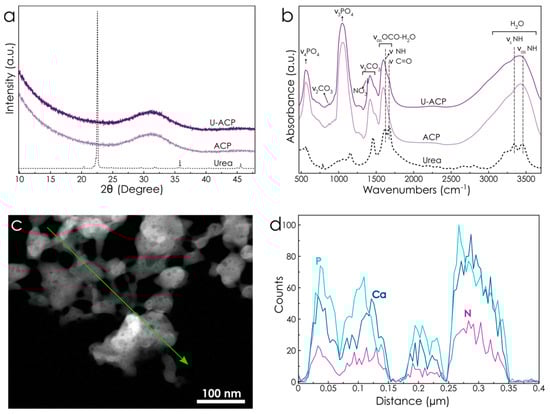 Structural and compositional characterization of U-ACP. XRD patterns (a) and FTIR spectra (b) of crystalline urea (dotted line), non-doped ACP nanoparticles and U-ACP nanocomposite. High-angle annular dark-field (HAADF) image (c) and line profile energy-dispersive X-ray spectroscopy (EDS) of U-ACP nanoparticles showing the Ca Kα (dark blue curve), P Kα (light blue), and N Kα (magenta) signals (d).