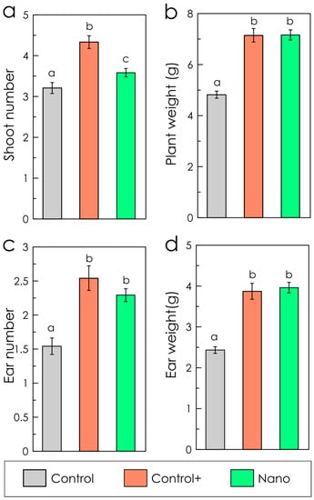Plant growth and development parameters of durum wheat. Shoots number (a), average weight (b), ear number (c), and ear weight (d) per individual wheat plant. Data are expressed as mean ± standard error. Data with different letters are statistically different (p ≤ 0.05). Total Nitrogen dosages were 36 kg N ha−1 as granular DAP (control); 186 kg N ha−1 as granular DAP (positive control); and 111 kg N ha−1, of which 15 kg N ha−1 as sprayed aqueous suspension of U-ACP and 96 kg N ha−1 as granular DAP (nano-treatment).