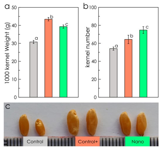 Yield parameters of durum wheat. Average thousand-kernel weight (a) and total kernel number (b) per plant. Data are expressed as average with the corresponding standard error as bars (n = 3). Different letters indicate significant differences between the treatments (p ≤ 0.05). Representative picture showing the kernel size of the different treatments (c).