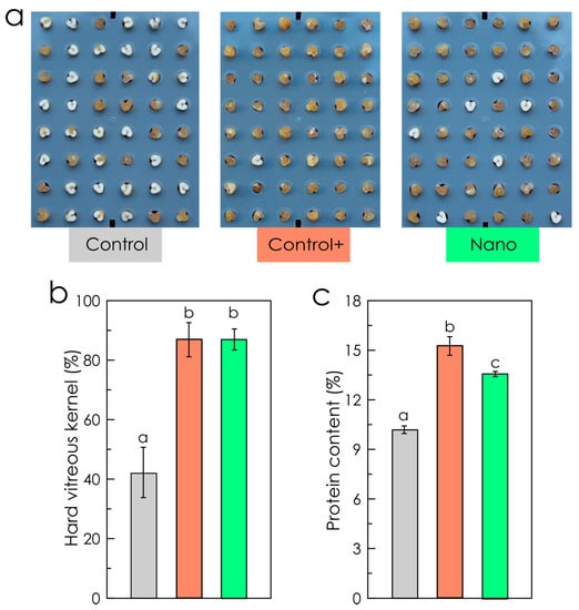 Quality parameters of durum wheat. Vitreousness of 48 split kernels (a). Percentage of hard vitreous kernel (b) and protein content (c) for the three treatments. Data are expressed as average with the corresponding standard error as bars (n = 3). Different letters indicate significant differences between the treatments (p ≤ 0.05).