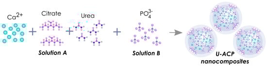The chemical composition of powdered samples (Ca and P) was analyzed by inductively coupled plasma optical emission spectrometry (ICP-OES, Optima 8300, Perkin-Elmer Inc., Waltham, MA, USA). 20 mg of the powdered sample were dissolved in 2 mL of ultrapure nitric acid and then diluted up to 100 mL with Milli-Q water. The emission wavelengths were 317.93 nm (Ca), 213.62 nm (P), and 766.49 nm (K). The total nitrogen content of the U-ACP nanocomposite was measured by elemental analysis with a Thermo Scientific Flash 2000 Organic Elemental Analyzer equipped with a microbalance (XP6, Mettler Toledo, Columbus, OH, USA) of the CIC-UGR. The urea content of U-ACP was quantified using the p-dimethylamino-benzaldehyde colorimetric method []. To this aim, 10 mg of powdered U-ACP sample was dispersed in 1 mL of ultrapure water and after 72 h, the sample was centrifuged and the urea concentration of the supernatant was measured by UV−vis spectroscopy []. Carbonate, citrate, and water contents were determined by thermogravimetry as described in [].