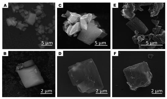 Schematically, the evolution of the morphology changes of the studied samples is presented in Figure 1 and it is drawn basing on SEM and TEM analysis. SEM images of the pristine MOF sample (A–B), after carbonization (C–D) and acid treatment (E–F) are presented in Figure 2. At each step, the samples (CMOF) exhibited trigonal prism-shaped particles. However, The CMOF–La and acid treated structures are more transparent due to probably more porous structure. In contrary, pristine MOF–La crystals containing metal are not transparent. The scanning electron microscopy images revealed that the surface of the MOF–La crystals is smooth and without any pores. Additional SEM images of CMOF–La-with-La crystals are presented in the supporting information (Figure S1). After CMOF–La hydrochloric acid purification, no La crystals are observed. The SEM images of CMOF structures show channels and pores left after La removal what is more visible in TEM analysis.