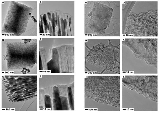 Figure 3 presents TEM images of carbonized CMOF–La (A–F) and acid treated CMOF (G–L) derived carbons. It is observed that the carbonized metal−organic frameworks after carbonization contains plenty of ordered channels which are loaded by metal oxide nanoparticles which form rod-like structures. The metal oxide particles copy the shape of the channels, some of them stick out of the CMOF–La. It is also observed that La-nanoparticles are arranged in one direction. In addition, some La oxide agglomerates can be noticed on the surface of the CMOF–La. The images 3E,F show that formed La oxide nanoparticles are responsible for the CMOF pore structure formation. The CMOF structure with opened channels left after acid treatment in the carbonized MOF is also presented. The comparison of the images in Figure 3A–F, indicates that during the MOF–La carbonization La nanoparticles are extracted from the interior and deposited on the external side of MOF structure. The higher resolution images prove that the channels of the CMOF are open-ended (Figure 3K,L). No crystalline structure was noticed, suggesting the amorphous structure of the obtained carbon nanomaterials.