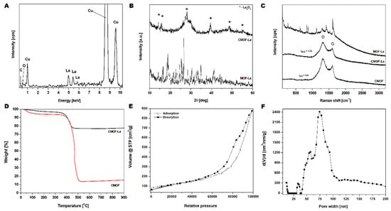EDS spectrum of the carbonized lanthanum-based MOF (A); XRD (B) and Raman (C) spectra of MOF–La, CMOF–La and CMOF; TGA analysis of CMOF–La and CMOF (D); N2 adsorption/desorption isotherms (E) and pore-width distribution (F) of CMOF.