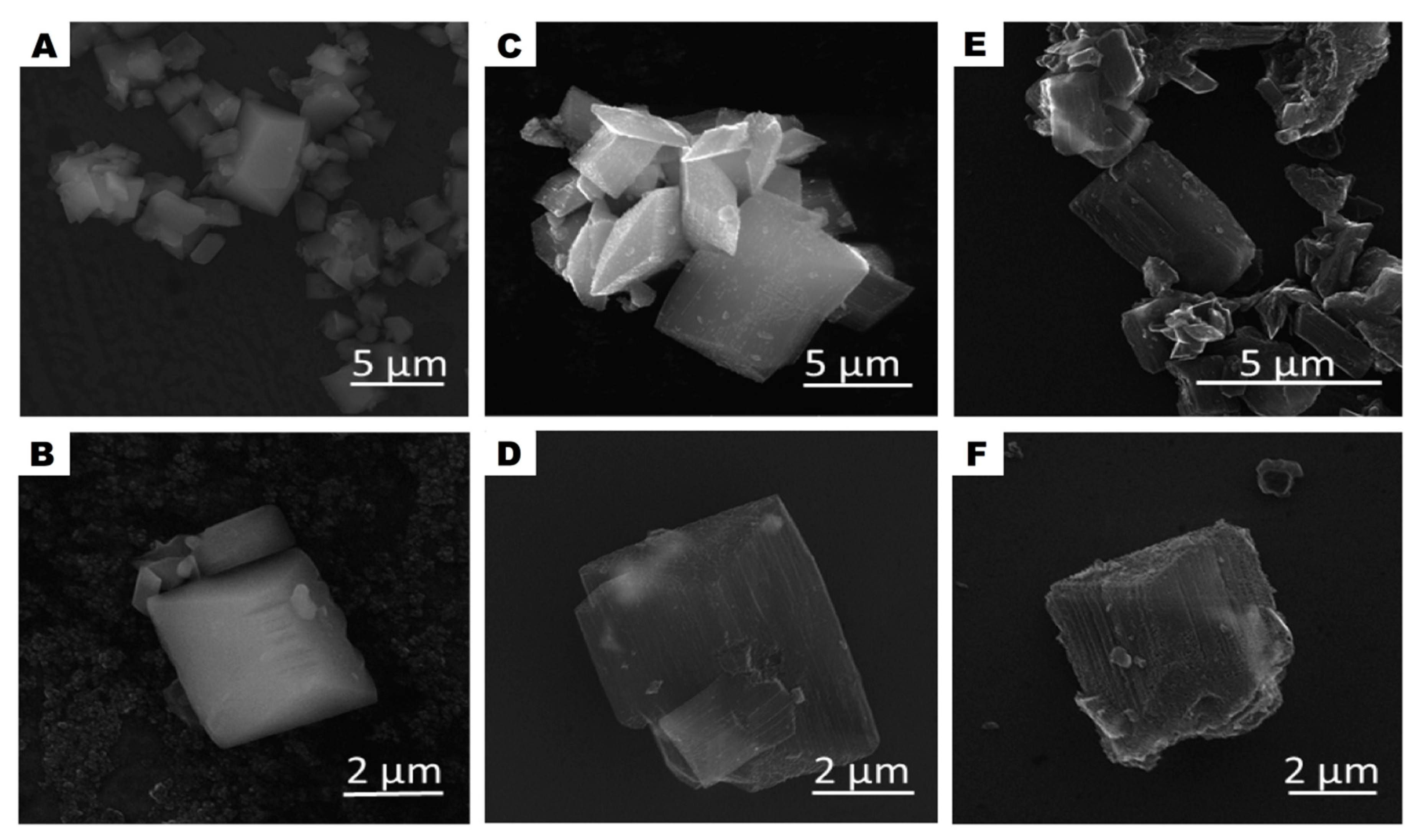 SEM images of MOF-La (A,B) and MOF-derived carbon structures CMOF-La (C,D) and CMOF (E,F).