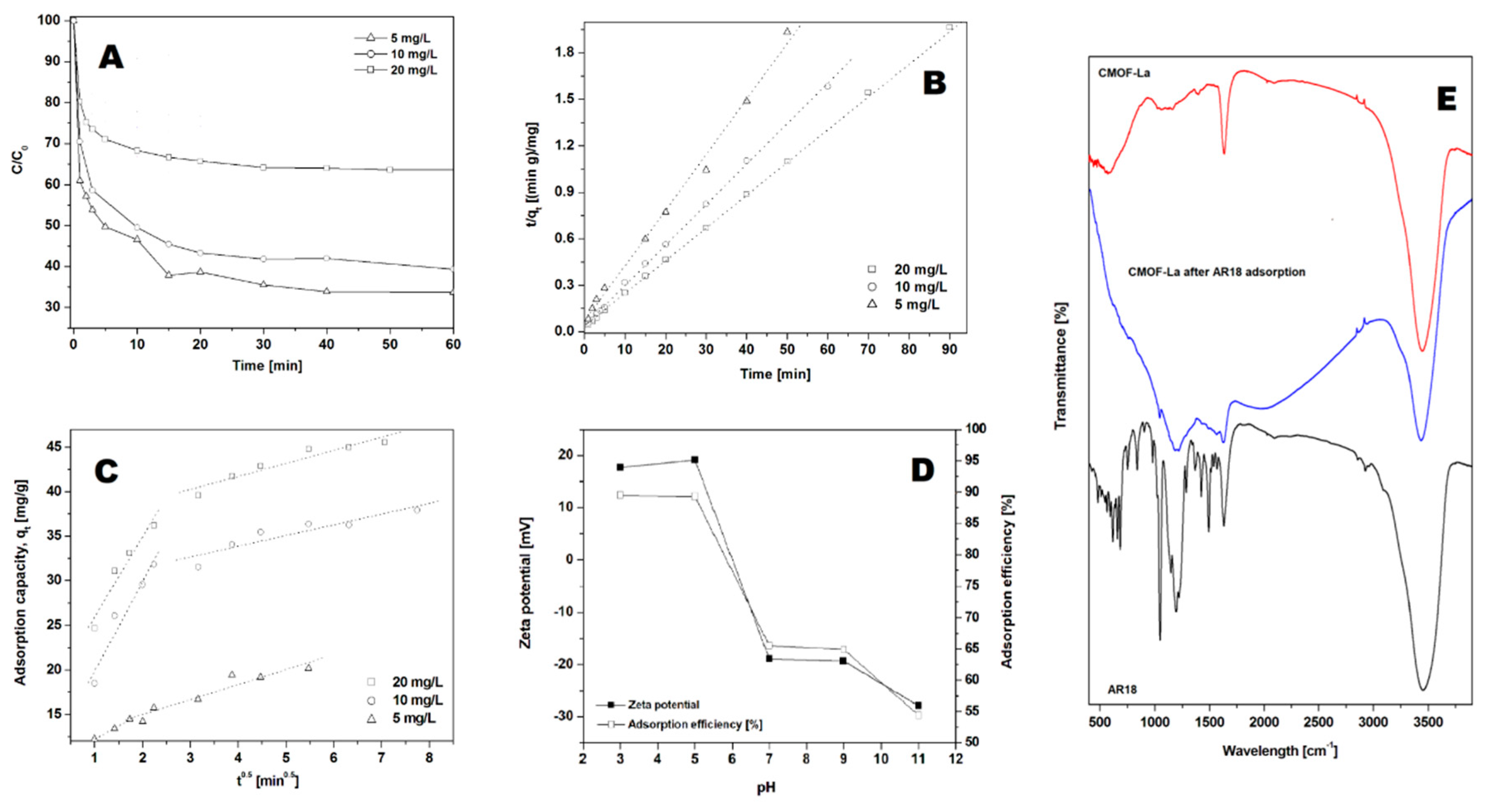 Effect of initial dye solution concentration (A) on adsorption capacity of the acid red 18 (AR18) onto CMOF. Pseudo-second-order kinetics (B) and intraparticle diffusion model (C) of acid red 18 adsorptions onto CMOF. Influence of initial pH and Zeta potential on dye adsorption (D). Experimental conditions: T = 20 °C, pH = 7. FT-IR spectra of carbonized MOF, CMOF after adsorption and AR18 (E).