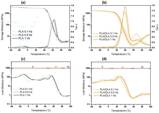 Figure 1d (PLA/OLA loss modulus) displays the existence of several transitions that fall into three main absorption regions from −30 to 10, 20 to 60 and 60 to 110 °C that have been labeled as β relaxation, α relaxation and cold crystallization region (cc), respectively. The sharp α peak, centered at around 40 °C in tan δ (Figure 1b), is accompanied by a sharp decrease in the storage modulus (E′) and corresponds to the segmental relaxation associated to the glass transition (micro-Brownian motions of long chain segments in the amorphous phase of the matrix). At temperatures below Tg, secondary relaxation processes (β transitions) are appreciated, as broad shallow peaks result from the movements of localized groups of backbone atoms in the amorphous phase due to an increase in free volume with temperature. After Tg relaxation, a slight increase in E′ and E″ is accompanied with a transition peak in tan δ, which is attributed to cold crystallization processes. As occurs with PLA/OLA [], in PLA three distinct regions can be differentiated. Apparently, the β transitions due to secondary relaxation processes seem not to be highly affected, while glass transition relaxation is clearly diminished, probably in association with the increase in free volume between chains due to the plasticizing effect of OLA. As expected, an increase in the frequency produces a shift to higher temperatures of the transitions, which is in line with results from the literature [].