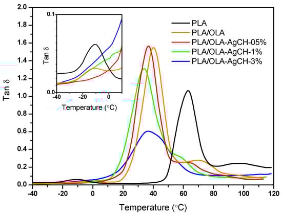 Temperature dependence of PLA, PLA/OLA and PLA/OLA-AgCH nanocomposite delta tangents (tan δ) at a frequency of 1 Hz.