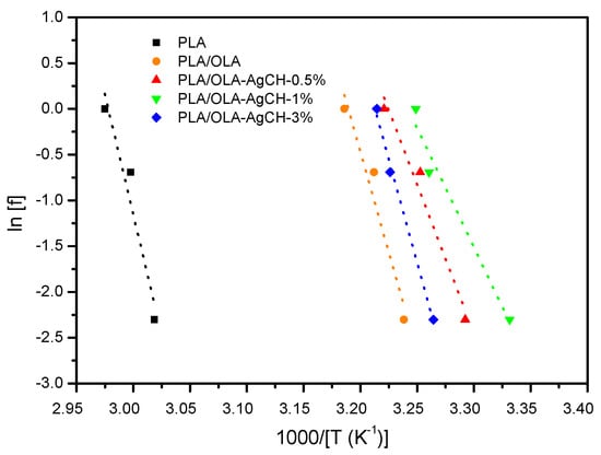 Figure 3 shows the values of lnf and (1/Tg) for Tg, determined as the maximum in tan δ. The activation energy related to the glass transition is obtained by multiplying the slopes of the 1/T vs. lnf plot with the gas constant, R = 8.314 × 10−3 kJ mol−1 K−1. The Ea values for the glass transition of the neat PLA and PLA/OLA systems are estimated as 435 and 365 kJ, respectively.
