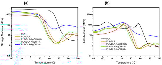 As can be observed in Figure 5, in the glassy state (at −40 °C), PLA/OLA and its nanocomposites containing 1–3 wt.% of AgCH-NPs show similar E′ values, 1811 MPa, 1578 MPa and 2134 MPa for neat PLA/OLA, 1 and 3 wt.% for AgCH-NP nanocomposites, respectively, while, for a lower amount of filler (0.5 wt.%), a slight decrease in the modulus occurs (966 MPa), which can be related to the absence of crystallinity in this sample. At ambient temperature (25 °C), the stiffness starts to display a reduction as all the samples are close to glass transition temperature and, upon increasing the temperature to 45 °C, the stiffness displays a drastic reduction, reaching values of ~4 MPa for nanocomposites containing 0.5–1 wt.% of AgCH-NPs and ~7 MPa for neat PLA/OLA. Interestingly, the addition of 3 wt.% of AgCH-NPs leads to a substantially higher reinforcement of the E′ moduli compared to neat PLA/OLA. Moreover, this reinforcement effect is retained despite the increase in the temperature and the cold crystallization.