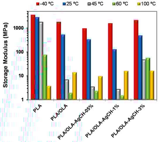 The stress at maximum deformation (Table 3) is lower for all the nanocomposites compared to pure PLA/OLA. This fact is in accordance with the effect of the AgCH-NP addition over the mechanical properties of PLA/OLA matrices reported in our previous work [].