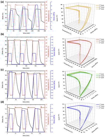 2D and 3D thermo-mechanical cycles performed at 45 °C for (a) neat PLA/OLA and its nanocomposites containing (b) 0.5 wt.% of AgCH-NPs, (c) 1 wt.% of AgCH-NPs and (d) 3 wt.% of AgCH-NPs.