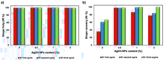 Under the conditions used, shape fixity ratios remained constant for all the samples and close to unity (Rf = 99–100%), without the appreciable influence of the AgCH-NP content or the number of cycles. Conversely, shape recovery ratios (Rr) were higher for all the nanocomposites compared to neat PLA/OLA, which showed an incomplete shape recovery (lower than 50% for the first cycle). Figure 7 details the graphical evolution of shape memory parameters (Rf and Rr) as a function of AgCH-NP content, complementing the information in Table 3. By incorporating AgCH-NPs into PLA/OLA, the recovery ratio in the first cycle improves, reaching the optimum at 0.5 wt.% of AgCH-NPs with an Rr of 98% and then, despite the better performance of the nanocomposites, a reduction in Rr to 86% and 77% was observed for samples with 1 and 3 wt.% of AgCH-NP content, respectively. According to DMTA results, these lower Rr values for the first cycle, with increasing AgCH-NP content, might be attributed to the enhancement of crystallinity and the more limited movement of amorphous polymer chains. Shape recovery is driven by the entropic stresses in the amorphous phase and, as shown in Figure 2, the magnitude of the tan δ transition decreases with increasing nanoparticle content, indicating that less mobile units are involved in the relaxation process and thus higher hysteresis occurs. With the increasing cycle number in the shape memory test, Rr shows an increasing trend, stabilizing near 100% after the second or third cycle for 1 and 3 wt.% of AgCH-NPs containing samples. Besides this training effect of Rr with cycles, strain recovery showed a strong dependence on nanoparticle content, whereas this dependence seems negligible for strain fixity performance.