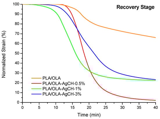 Figure 8 shows the evolution over time of the normalized strain during the recovery stage of the first cycle of the shape memory, for neat PLA/OLA and its nanocomposites at 45 °C. It could be seen that, for the same recovered strain (i.e., 80% of strain, thus 20% of strain recovered), all the nanocomposites presented faster recovery than the neat PLA/OLA, with the fastest being the nanocomposite containing 1 wt.% of AgCH-NPs. All the materials presented their Tg at lower temperatures than the set for recovery (45 °C) and, in spite of similar glass transitions to neat PLA/OLA and 3 wt.% of AgCH-NP samples, the recovery of the latter is faster. Thus, it seems that the presence of AgCH-NPs provides an extra force to the PLA/OLA matrix, helping the molecular chains to return to their original configuration.