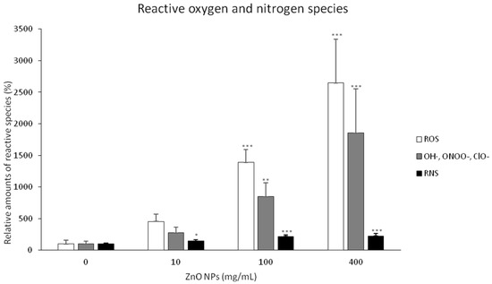 4.3. ZnO NPs Increased the Level of ROS and RNS and Activated the ROS Defense System