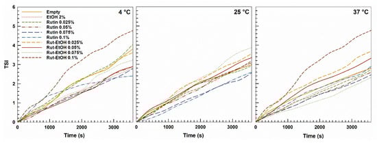 The stability of P407-based hydrogels containing rutin at different concentrations, either with or without ethanol, was assessed by multiple light scattering (MLS) using a Turbiscan® Lab Expert (Formulaction, France). The analyses were carried out at 4 °C (storage temperature), 25 °C (room temperature), and 37 °C (body temperature) and reported as TSI variation. As shown in Figure 2, the stability kinetic profiles of the various formulations are very similar and no significant variation resulted over time, evidencing the absence of any phenomena such as sedimentation, migration and/or flocculation, as was also demonstrated by the ∆BS and ∆T (Figures S3 and S4).