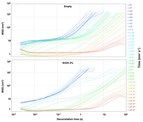Rheology is the study of the deformation and the flow characteristics of materials subjected to an external force or stress []. In micro-rheology, the particles contained in a formulation are used to measure the local deformations that occur due to an applied external stress (active micro-rheology) or simply through the evaluation of their Brownian movement (passive micro-rheology) []. The Rheolaser® Master uses the MS-DWS technique for the micro-rheological analyses of viscoelastic systems at rest []. Figure 3 shows the MSD curves of the P407-hydrogels both as empty formulations and prepared with ethanol (2%, w/w).