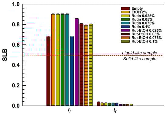 The results confirm the behavior of the formulations previously described. In fact, the SLB values of all the formulations have been shown at the beginning (ti = 1 min) and at the end (tf = 30 min) of the analysis with the aim of demonstrating that rutin does not dramatically modify the typical thermo-sensitive behavior of the poloxamer-based hydrogels. In all cases, the formulations showed an SLB value greater than 0.5 in the first minute of analysis, confirming their liquid behavior, while it was close to 0 by the end of the analysis, showing the phase transition of the formulations at 37 °C.