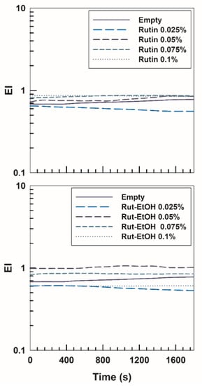 Elasticity index (EI) of rutin-loaded P407 hydrogels as a function of the time. The analysis was performed at 37 °C.