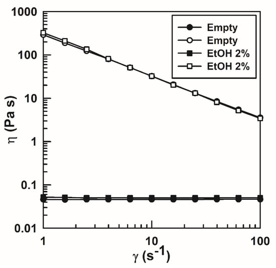 Viscosity profiles of P407 (20%, w/w) hydrogels as an empty formulation or prepared using ethanol (2%, w/w) as a function of the shear rate. The analysis was performed at 4 °C (black symbols) and 37 °C (white symbols).