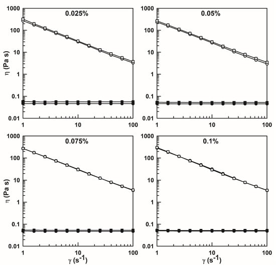 All investigated systems exhibit a Newtonian and non-Newtonian shear thinning behavior at 4 °C and 37 °C, respectively, in agreement with previous experimental investigations [,,,]. In fact, the temperature and the polymer concentration can influence the rheological features of P407 “solutions” which can exhibit either Newtonian (below the Tsol-gel and CMC) or non-Newtonian (above the Tsol-gel) behavior [,,].