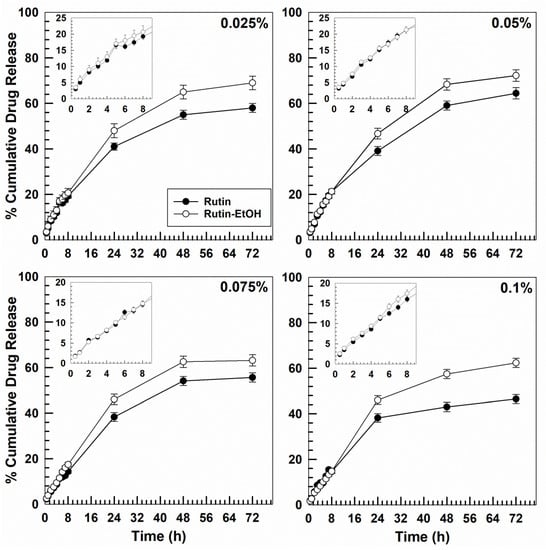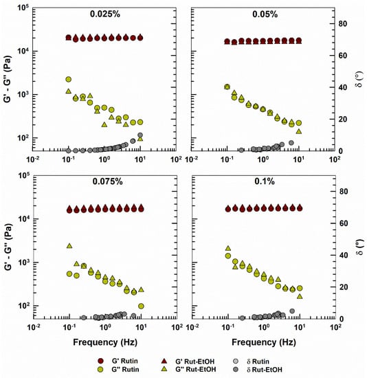 The presence of rutin within the polymeric matrix did not modify the viscoelastic behavior of the system, which still appeared typical of a gel-like material (Figure 8). Moreover, as expected, the profiles of the formulations containing rutin added as a free powder or previously solubilized in ethanol are superimposable. These profiles are very similar to that of the rutin-and ethanol-free formulation (Figure S7). The values of the phase angle (δ) of the various hydrogels are reported in Table S2.