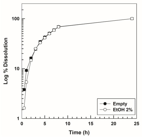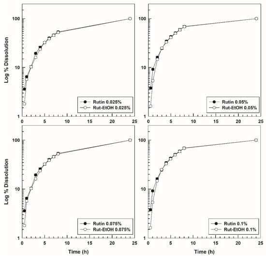 The dissolution profile of the empty formulation is shown in Figure 9. As previously confirmed by other authors, the dissolution of the hydrogel occurs constantly and rapidly, that is, virtually 100% after 24 h []. This result is probably due to the high solubility of P407 in aqueous media and this is important for the design of an in situ gelling formulation because the dissolution properties modulate the drug leakage at the administration site []. Again, neither the rutin nor the ethanol influenced the dissolution rate of the P407-hydrogels (Figure 9 and Figure 10).