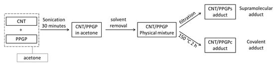 In the experimental part, the functionalization of CNT by using PPGP as the modifying agent is described extensively. In brief, CNT were initially sonicated in the presence of the pyrrole terminated polymer (PPGP) in acetone, leading to the formation of the CNT/PPGPs adducts (supramolecular adduct) after removal of the solvent and washing with acetone. However, in a one-pot process involving the direct thermal treatment of the physical mixture (150 °C, 2 h), the covalent adduct CNT/PPGPc was easily obtained. No further optimization of the reaction conditions was performed.