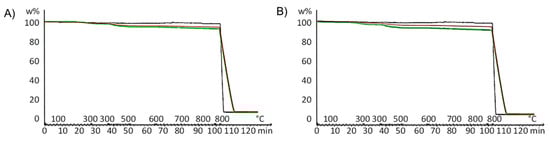 Thermogravimetric analysis (TGA) curves of: (A) single-wall carbon nanotubes (SWCNT) (black line), SWCNT/PPGPs (green line), and SWCNTc (red line); (B) multi-walled carbon nanotubes(MWCNT) (black line), MWCNT/PPGPs (green line), and MWCNTc (red line).