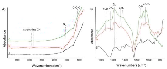 FT-IR spectra of MWCNT (a), MWCNT/PPGPs (b), and MWCNT/PPGPc (c). (A): 700–3900 cm−1 region; (B) fingerprint region 700–1800 cm−1 after baseline correction. Spectra are displayed with normalized intensity. Peaks discussed in the text are labeled.