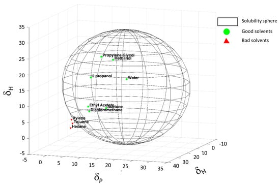 The introduction of PPGP on the surface of the carbon allotropes allows the dispersion in polar environments thanks to the long polyether chain. The solubility sphere shown in Figure 5 was generated, as explained in the experimental part, to encompass the suitable solvents points and to exclude the wrong solvents, being centered on the solubility parameters of the MWCNT/PPGPc adduct. Solubility parameters, δD, δP, and δH values, of MWCNT/PPGPc adduct, were estimated to be 11.48 MPa0.5, 15.40 MPa0.5, and 18 MPa0.5, respectively.