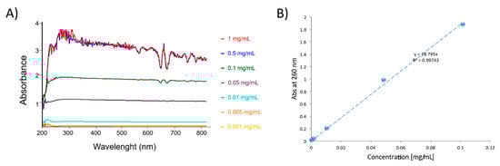 Absorption values corresponding to a wavelength of 260 nm for MWCNT-PPGPc adduct curves were plotted as a function of concentration values. In Figure 7B, a linear correlation is reported.