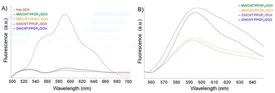 DOX hydrochloride (9 mg) was stirred with the selected CNT/PPGP adduct (3 mg) dispersed in a pH 7.4 Phosphate Buffered Saline solution (PBS) (6 mL) and stirred for 16 h at room temperature. The product was collected by ultracentrifugation with PBS until the supernatant became colorless. The amount of unbound DOX was determined by measuring the absorbance at 490 nm of the supernatant after centrifugation see Table S1. The CNT/PPGP/DOX nano complex dispersions in PBS were also analyzed by fluorescence spectrophotometry: dispersions were placed using a Pasteur pipette (Colaver s.r.l, Vimodrone, Italy) in a triangular quartz cuvette. A Jasco FP-6600 Spectrofluorometer (JASCO corporation, Tokyo, Japan) was used to perform the fluorescence measurements. The fluorescence detector was set at an excitation wavelength of 480 nm, and fluorescence spectra in the range of 500–700 nm were collected.