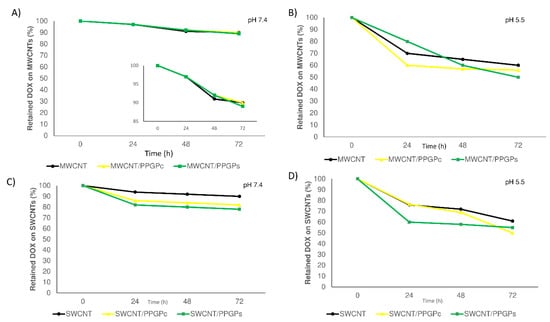 No initial burst effect was observed in either of the conditions adopted. After 72 h, at pH 7.4 the amount of released DOX was in the range of 10–11% for MWCNT/DOX and MWCNT/PPGP/DOX complexes Figure 11A and of 10–20% for SWCNT/DOX and SWCNT/PPGP/DOX (Figure 11C). At pH 5.5, a different behavior was observed for CNT/DOX and CNT/PPPG/DOX complexes. Regarding MWCNT/DOX and MWCNT/PPGP/DOX complexes (Figure 11B), the amount of DOX released over a 72-h period was observed to be faster for MWCNT/DOX and MWCNT/PPGPc/DOX, while for MWCNT/PPGPs/DOX a controlled and a linear release was observed. In contrast, for SWCNT/DOX and SWCNT/PPGP/DOX complexes, the release of DOX at pH 5.5 Figure 11D was found to be faster for MWCNT/PPGPs/DOX and lower for MWCNT/DOX and MWCNT/PPGPc/DOX. The different complexes CNT/PPGP/DOX could satisfy different release rates, depending on the type of CNT and the nature of the interaction with PPGP and DOX.