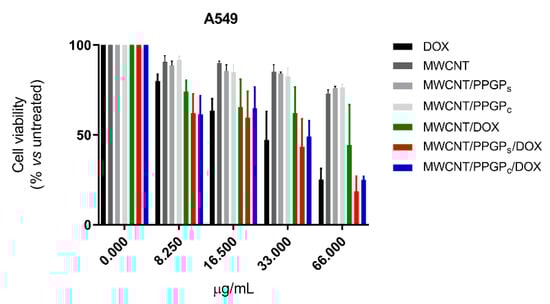 The cytotoxic properties of loaded DOX were compared with that of the free DOX (Figure 12 and Figure 13) at four different concentrations (8.25 µg/mL, 16.5 µg/mL, 33 µg/mL, 66 µg/mL) after 48 h of treatment. Our preliminary results indicated that DOX maintains its inhibitory effect for all the investigated cases (free DOX, covalently loaded DOX, or complexed DOX) on both A549 and M14 cellular lines. Moreover, from our data, it emerges that there is a different behavior for the CNT drug delivery systems with a cell variance. MWCNT/DOX showed lower activity compared to the free DOX on M14 cellular lines; MWCNT/PPGPc/DOX and the free DOX displayed a similar effect on both cellular lines at all the investigated concentration; MWCNT/PPGPc/DOX appeared more efficient than free DOX in A549 cell lines and less efficient than the free DOX in MT14 ones.