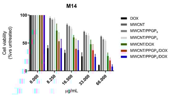 In order to estimate the likelihood of our CNT drug delivery systems, the cytotoxicity of MWCNT, MWCNT/PPGPs, MWCNT/PPGPc, MWCNT/DOX, MWCNT/PPGPs/DOX, and MWCNT/PPGPc/DOX on A549 and M14 cell lines was evaluated. A stock dispersion of each CNT was prepared in culture medium at 1 mg/mL and sonicated. This procedure was ineffective for SWCNT, SWCNT/PPGPs, SWCNT/PPGPc, SWCNT/DOX, SWCNT/PPGPs/DOX, and SWCNT/PPGPc/DOX samples because of the persistence of carbon aggregates and agglomerates turned into the absence of a homogenous dispersion suitable for evaluation in cell culture assay. Indeed, the stock dispersion of MWCNT, MWCNT/PPGPs, MWCNT/PPGPc, MWCNT/DOX, MWCNT/PPGPs/DOX, and MWCNT/PPGPc/DOX was further diluted considering the amount of loaded DOX into each sample, as reported in Table S1. Thus, the concentrations were normalized and reported as the DOX amount.