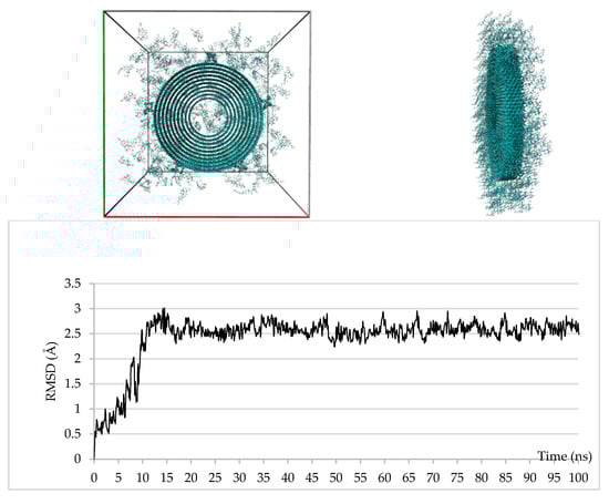 Although some molecular dynamics (MD) studies upon DOX/SWCNT systems were already performed [,,,,,], to the best of our knowledge, this is the first one that takes in consideration even a DOX/MWCNT system and, in particular, the use of opportunely reduced systems which reflects the actual diameter of the CNTs employed for the reported experiments and the CNT/PPGP/DOX ratios obtained from the experimentally observed weight percentages. So, we built four supramolecular systems named SSy1–4 corresponding to the complexes SWCNT/PPGPs/DOX, SWCNT/PPGPc/DOX, and MWCNT/PPGPs/DOX, MWCNT/PPGPc/DOX, respectively, and submitted each of them to 100 ns MD simulations. For each experiment, we used three different systems in which the starting positions of the PPGP and/or DOX molecules were randomly varied.