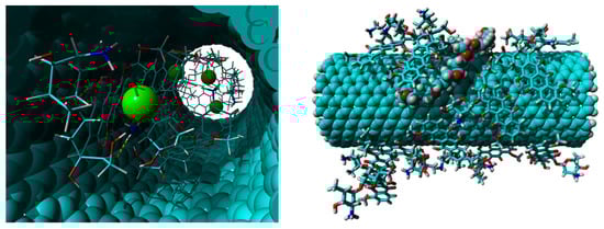 Left: view of the DOX molecules and the chloride ions contained inside the SWCNT cavity of the SSy2 at the end of the 100 ns of the MD simulation; right: view of the DOX molecules and the PPG pendant anchored to the external wall of the SWCNT of the SSy2 at the end of the 100 ns of the MD simulation.