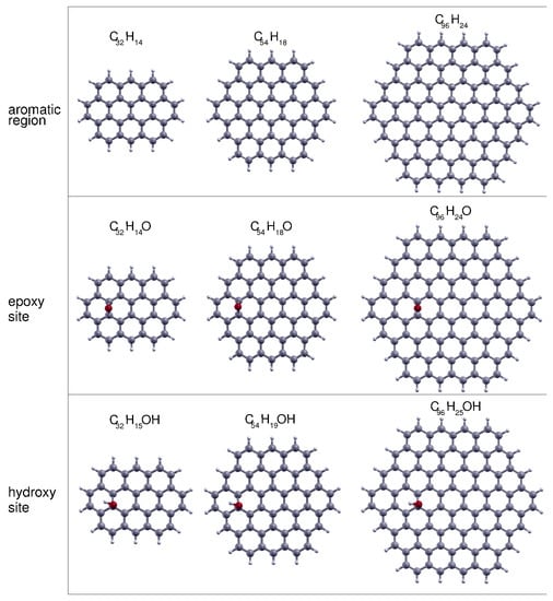 Graphene oxide molecular prototypes of increasing size. Those describing the aromatic region (first row) are ovalene (CH), circumcoronene (CH) and circumcircumcoronene (CH). The prototypes describing the oxidized sites are obtained by adding one epoxy (second row) or one hydroxy (third row) group to those of the first row.