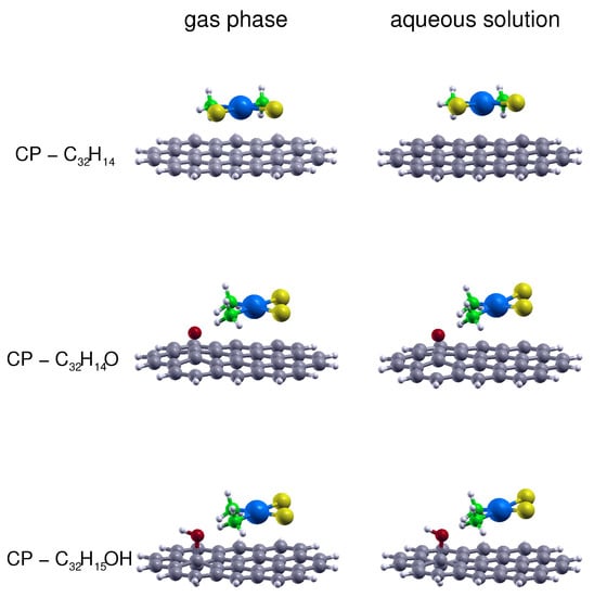 To better assess the viability of the CP adsorption in a more realistic medium such as an aqueous solution we have performed geometry optimizations by means of the SMD continuum solvation model, whose results are shown in Figure 3 together with the corresponding gas-phase estimations: it can be appreciated that both models provide quite similar configurations although a small increase in the angle between the CP and the GO prototype can be appreciated for the SMD results, which leads to a slightly larger distance (of about 0.15 Å) between the Pt and the aromatic C plane. This suggests that the nature of the bonding should not significantly change in the gas phase and water solution. In Table 4 we finally report present estimations for the adsorption enthalpy (H) and free energy (G), both in gas phase and aqueous solution, computed at 298.15 K and 1 bar for CP physically sorbed on GO and on rGO. For the adsorption on GO we have chosen the results obtained for the circumcoronene-based supports. The predicted values for rGO have been obtained from the circumcoronene results by scaling the adsorption enthalpies using the interaction energies computed for the related CH and CH supports, which are reported in Table 2. It can be seen that for all considered sites the CP adsorption on GO and rGO is a significantly exothermic and exoergonic process in both the gas phase and aqueous solution. As expected, the most favorable adsorption occurs in correspondence of the hydroxy group, followed by the expoxy and aromatic region sites. In particular, H and G values related to the aqueous solution CP adsorption in correspondence of the oxidized sites are significantly larger (between 10 and 30% and between 15 and 45%, respectively) than those for the aromatic region, confirming the fundamental role of hydrogen bonding contributions also in the condensed phase. An indication of such favorable enthalpy and free energy adsorption variations, though calculated at a much lower and only qualitative level of theory (B3LYP/3-21G (d)), also emerged in the case of GO-coated chitosan, due to hydrogen bonding between the cisplatin ammonia and GO epoxy and hydroxy groups [22].