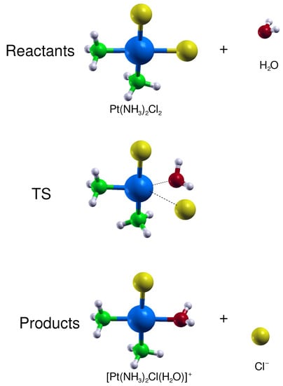 First, we have tested the capacity of the present DFT approach (adopted in the previous section to study the cisplatin physical adsorption) to predict the drug activation and reaction energies. Cisplatin first hydrolysis proceeds through a S2 substitution in which the nucleophile water molecule displaces the chloride ion leaving group (see Figure 4) and involves a distorted trigonal-bipyramidal transition state (TS) [61,62,63].