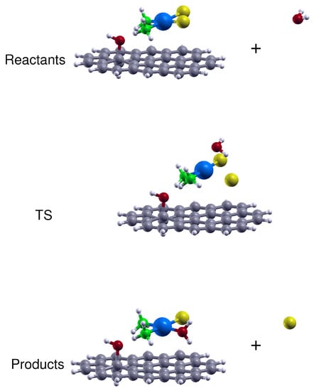 Side views of the reactants, transition state (TS) and products optimized structures related to the CP hydrolysis reaction with the drug adsorbed on a hydroxy site of a GO (or rGO) platelet. The reported structures are those obtained in aqueous solution by considering the SMD continuum solvation model.