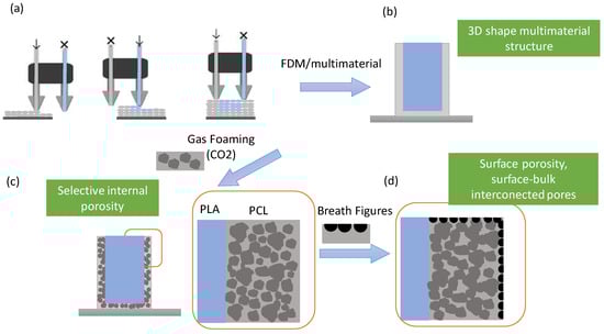 Strategy employed to fabricate 3D multi-material porous scaffolds with internal and external porosity. (a,b) Multi-material 3D printing of poly (lactic acid) (PLA)/poly (ε-caprolactone) (PCL) parts, (b,c) foaming of the parts using supercritical CO2 (SCCO2), (c,d) surface porosity formed using the breath figures approach.