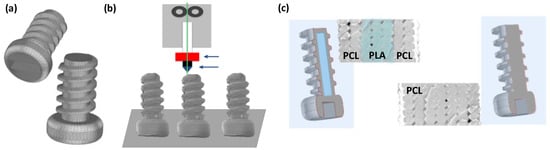 For the fabrication of the 3D-printed parts, the design of the 3D structures was achieved by using a computer-aided design (CAD) software (Figure 2). To illustrate the feasibility of this strategy, a screw structure was employed as a model. The models were printed by fused deposition modeling (FDM) either using exclusively PCL or combining an internal PLA structure and an external PCL structure. The rationale behind this selection of degradable materials relies on different aspects. First, the biocompatibility of both materials (FDA approved) enable us to test these parts for their use in biomedical purposes []. Secondly, PCL is non-toxic and tissue compatible, and hence widely used as absorbable sutures, as scaffolds in regenerative therapy, and in drug delivery applications. PCL exhibits a longer degradation time (2–3 years) in comparison to PLA and is degraded by microorganisms or by hydrolysis of its aliphatic ester linkage under physiological conditions [,]. Third, PCL has been previously employed in our group and successfully foamed by using the SCCO2 approach and surface treated with the breath figures methodology []. Finally, PCL and PLA present, in terms of mechanical properties, very different behaviors. At physiological temperature, the semi-crystalline PCL attains a rubbery state resulting in its high toughness [] and high elasticity. PLA, in contrast, is rather rigid and breaks upon deformations of 8–10% []. Their combination will enable, as will be depicted later, the fabrication of objects with mechanical properties that can be gradually varied.