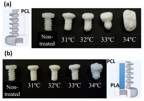 Optical photographs of the 3D-printed parts upon treatment in SCCO2 at different temperatures. (a) Screws fabricated using PCL, (b) screws fabricated using a combination of PCL and PLA (protocol: 200 bar, 5 min).