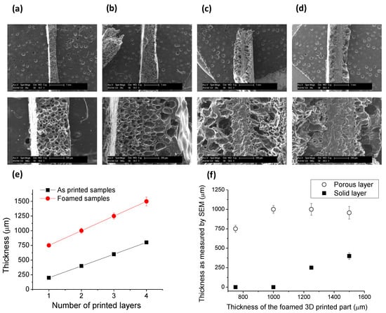 Cross-section SEM images of 3D-printed samples with a variable thickness of (a) 200 µm, (b) 400 µm, (c) 600 µm, and (d) 800 µm. (e) Representation of the thickness of the printed part (as printed) versus the foamed part. (f) Representation of the porous layer and the solid inner layer as a function of the thickness of the printed part foamed. (SCCO2 treatment conditions: 200 bar and 31 °C).