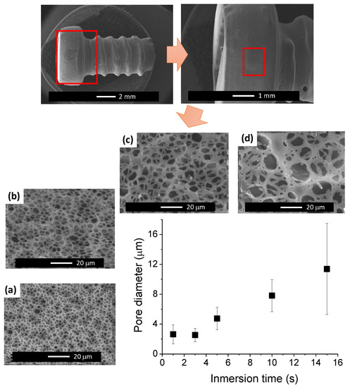 As has been largely depicted in the recent literature, one of the major limitations of SCCO2 treatment is related to the ’so-called’ skin layer that is associated to the rapid diffusion of the embedded fluid out of the sample edges which results in the formation of this dense nonporous skin layer. While the thickness of this layer can be decreased to a certain extent, for instance, by an increase in pressure [], the complete removal of the skin layer still remains a major issue. In order to overcome this limitation, the breath figures approach was employed to remove this skin layer and enable the preparation of porous scaffolds with continuous internal–external porosity []. The breath figures approach has been largely employed to produce microporous surfaces by evaporation of polymer solutions using a volatile solvent. Experimentally, this strategy requires the dissolution of the polymer and evaporation in a moist atmosphere. As a result, during the evaporation, the water vapor is able to condense and form water droplets at the polymer solution/air interface. Finally, these water droplets evaporate and leave microporous cavities at the surface. While this strategy has usually been carried out using polymeric solutions, an alternative to this involves the preparation of microporous surfaces by dip-coating. In this case, a solid polymeric part is immersed for a short period of time (seconds) in the appropriate solvent, removed from the solvent, and allowed to dry in a closed vessel chamber. The relative humidity or the immersion time are among the parameters that play a critical role of the micropore formation at the surface of the polymer part. In this study, the relative humidity was maintained constant at values between 95–100% r.h. to assure the presence of a large amount of water vapor that can be condensed at the surface. While the relative humidity was held constant, the immersion time was varied between 1 and 15 s. In Figure 6, the SEM images of 3D-printed and foamed screws that were treated using the breath figures approach varying in immersion time are depicted. As can be observed in the images in Figure 6a–d, the pore size clearly increased by increasing the immersion time. In fact, a larger immersion time associated with a deeper swelling of the polymer surface, accumulating more solvent, and thus enabling the evaporation process to occur during a longer period of time. As a result, the water vapor can be condensed during longer periods of time, forming larger water droplets, and finally, upon evaporation of the water droplet, larger pores. In the graph presented in Figure 6, a gradual variation of the micropore diameter between 3 μm and 12 μm is evidenced. Equally, the heterogeneity in terms of size gradually increased producing a rather disperse distribution of pores for the largest immersion time employed (15 s).